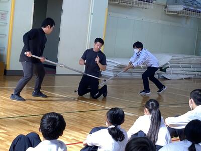 川口警察の協力を得て、不審者対応訓練とともに、さすまたの使い方を学びました。