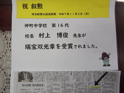第16代校長 村上 博俊 先生が瑞宝双光章を受賞されました。 投稿: 管理者 (13:29) 仲町中学校の開校記念日に嬉しいお知らせが届きました。 村上先生、おめでとうございます!! 謹んで心よりお祝い申し上げます。 Tweet -